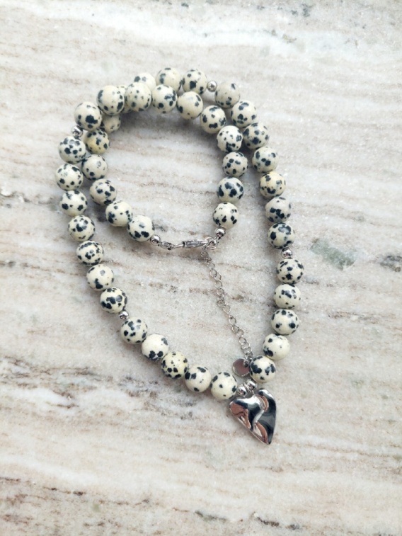 Naszyjnik z jaspisu dalmatyńskiego przeplatany srebrnymi kuleczkami stalowymi. Całość uzupełniona ozdobną zawieszką w kształcie nieregularnego serduszka.