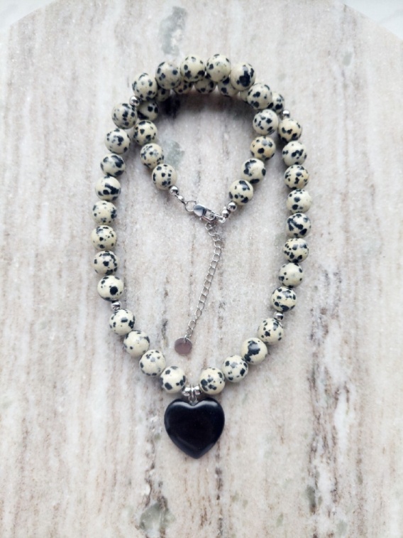 Naszyjnik z jaspisu dalmatyńskiego przeplatany srebrnymi kuleczkami stalowymi. Całość uzupełniona ozdobną zawieszką z onyksu.