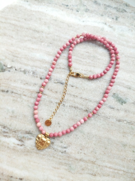 Naszyjnik z fasetowanego rodonitu różowego. Przeplatany złotymi kuleczkami stalowymi. Całość uzupełniona ozdobną zawieszką w kształcie serduszka.